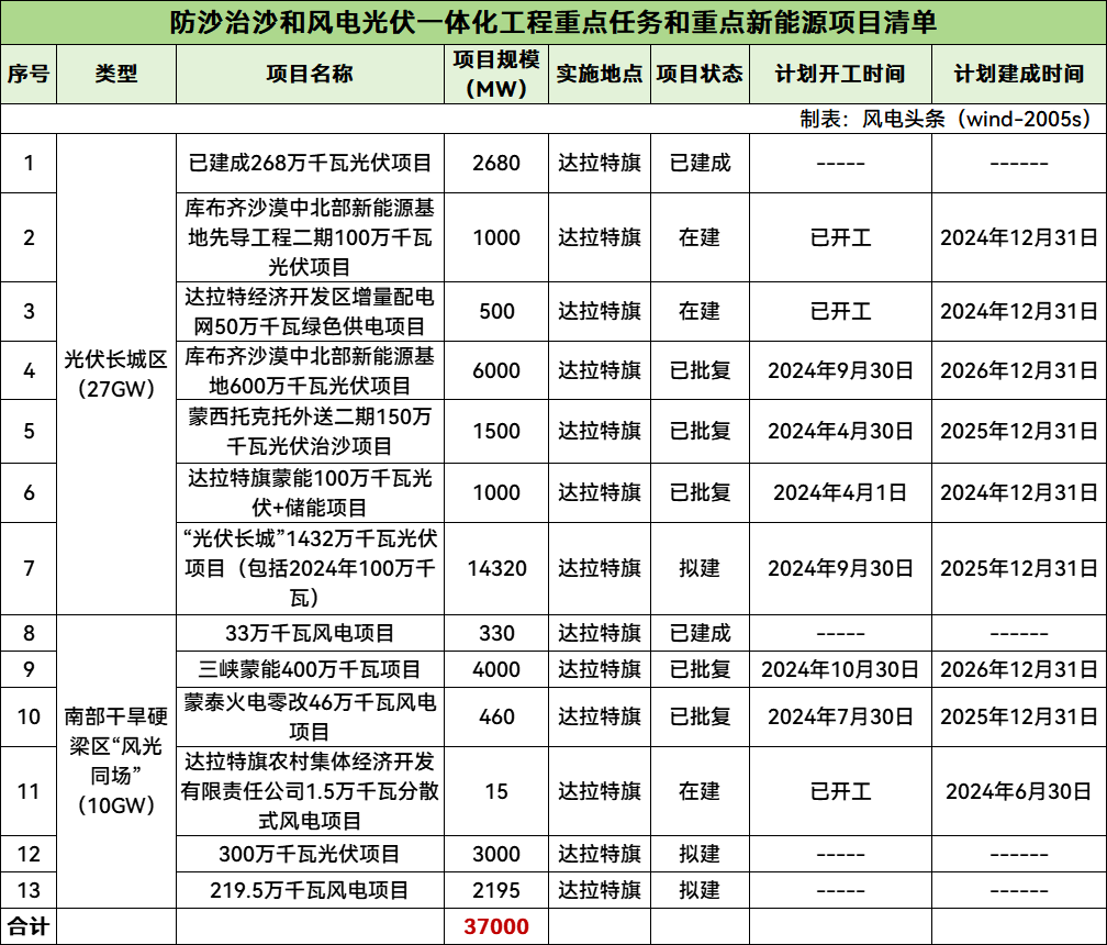 此外,《防沙治沙和風電光伏一體化工程重點任務和重點項目清單》顯示,共有新能源項目13個,項目規模共計37GW。
