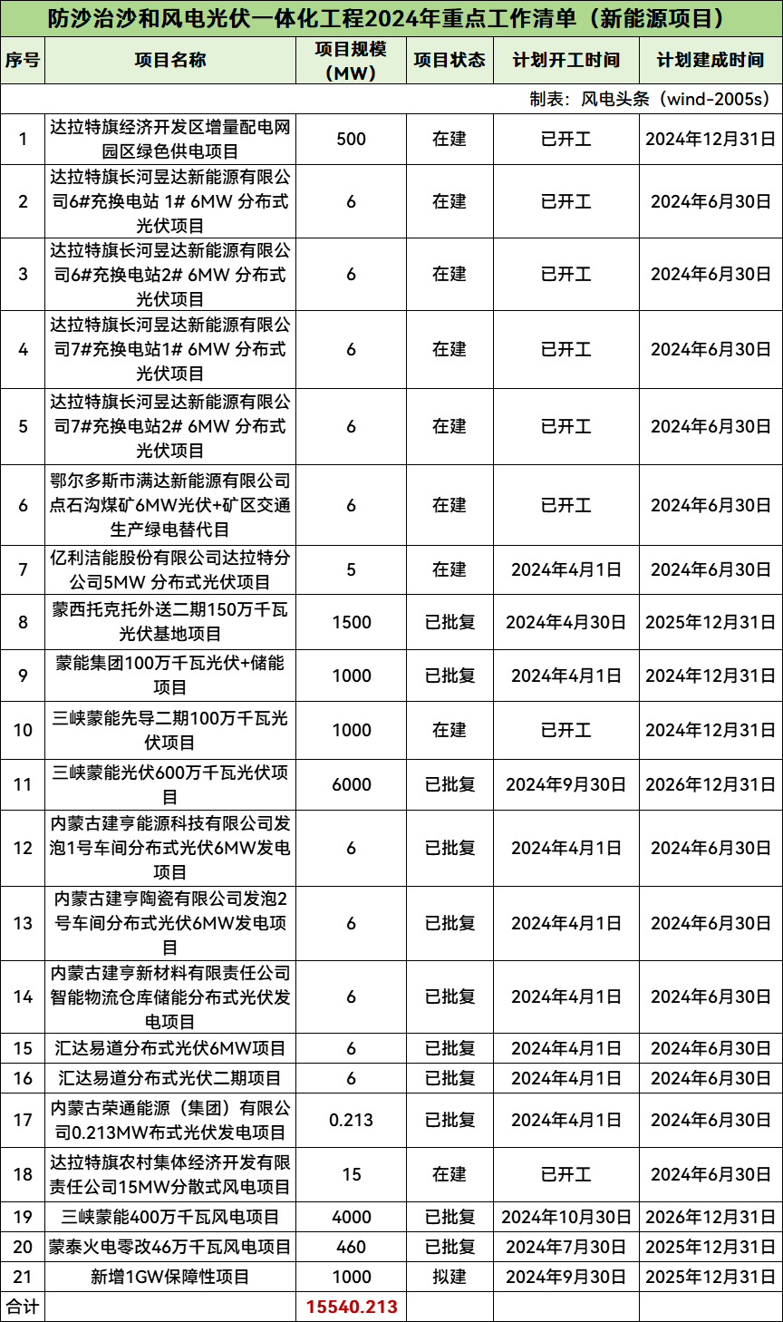 《防沙治沙和風電光伏一體化工程2024年重點工作清單》顯示,2024年重點建設新能源項目21個,項目規模合計15.54GW。