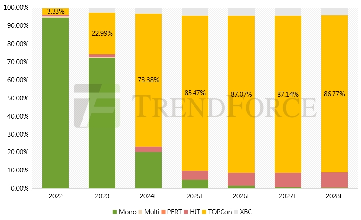 圖:2022-2029年不同類型電池片產(chǎn)出占比趨勢(shì)