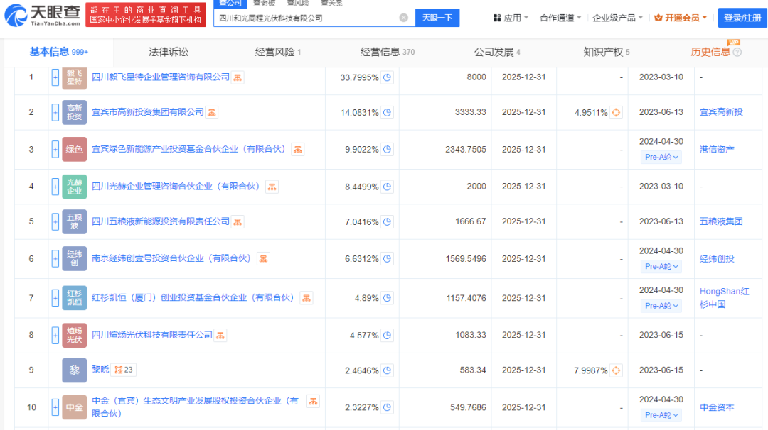 資料顯示,和光同程成立于2023年,是一家位于四川宜賓的光伏行業電池研發制造商,主營電池制造、太陽能發電技術服務、光伏設備及元器件制造等。其第一大股東四川毅飛星特企業管理咨詢有限公司的唯一股東是謝毅,與此同時,謝毅還持有四川光赫企業管理咨詢合伙企業(有限合伙)27.5%的股份。謝毅出生于1984年,曾任通威集團總裁助理、通威太陽能(合肥)有限公司董事長、通威太陽能(成都)有限公司董事長等。