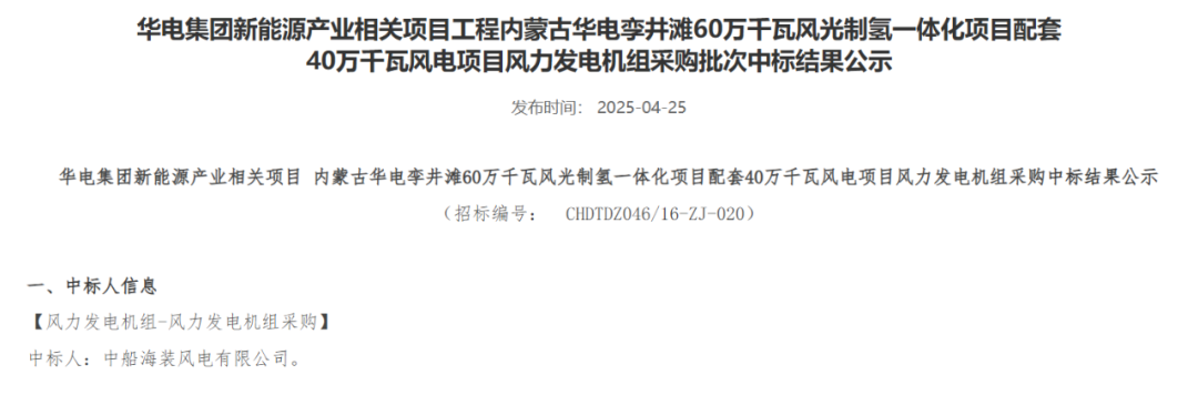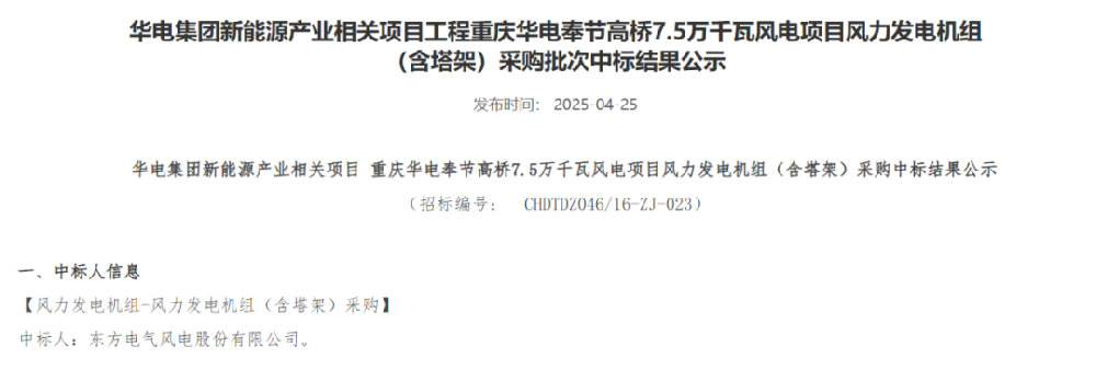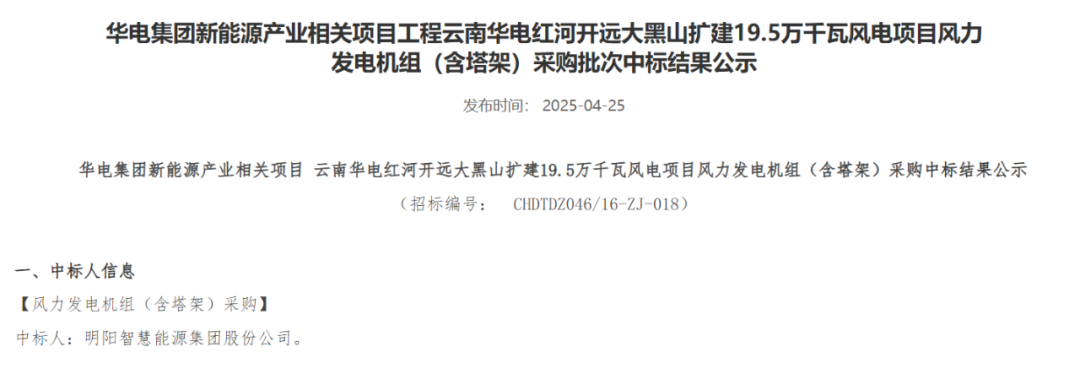 近日,華電集團(tuán)電子商務(wù)平臺(tái)發(fā)布重慶華電奉節(jié)高橋7.5萬(wàn)千瓦風(fēng)電項(xiàng)目、黑龍江華電佳木斯湯原一期200MW風(fēng)電項(xiàng)目、內(nèi)蒙古華電孿井灘60萬(wàn)千瓦風(fēng)光制氫一體化項(xiàng)目配套40萬(wàn)千瓦風(fēng)電項(xiàng)目、云南華電紅河開(kāi)遠(yuǎn)大黑山擴(kuò)建19.5萬(wàn)千瓦風(fēng)電項(xiàng)目、黑龍江華電黑河北安建華20萬(wàn)千瓦風(fēng)電項(xiàng)目、貴州華電松桃長(zhǎng)興、金海湖新區(qū)烏箐、安順西秀巖臘、望謨郊納風(fēng)電項(xiàng)目31.25萬(wàn)千瓦、甘肅華電臨夏州鹽鍋峽鎮(zhèn)下銓村和通渭縣孟河村、盧董村“千鄉(xiāng)萬(wàn)村馭風(fēng)行動(dòng)”試點(diǎn)項(xiàng)目5萬(wàn)千瓦風(fēng)力發(fā)電機(jī)組采購(gòu)中標(biāo)結(jié)果公示的公告。