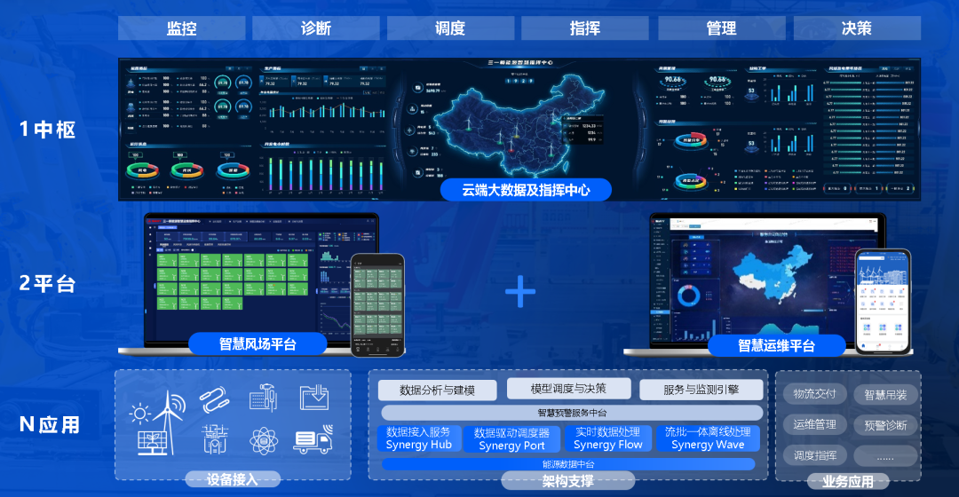 三一重能基于物聯網、大數據、人工智能等先進信息化技術,構建了“1中樞、2平臺、N應用”的數字化場站管理模式,實現風場區域全場景的智慧化管理。依靠風機診斷與故障預警模型,對機組實時進行健康診斷,實現對故障的提前預判,通過“預測、預警、預檢、預修”的預防性運維舉措,減少計劃外停機時長及次數,降低發電量損失。