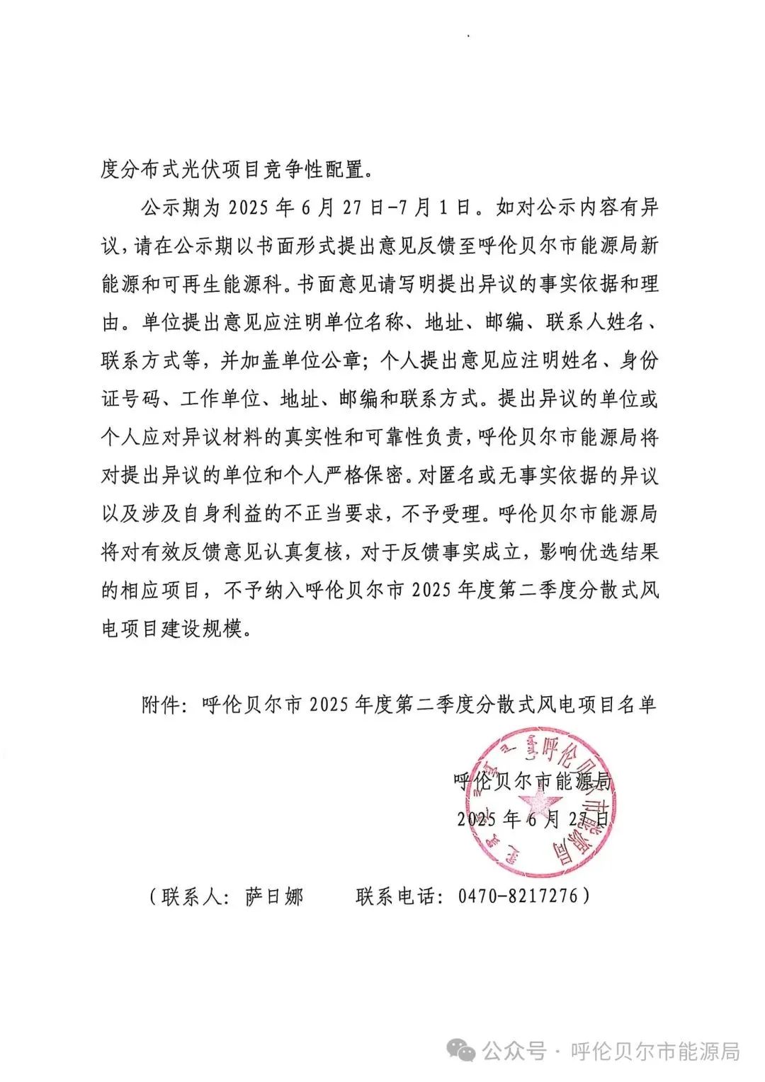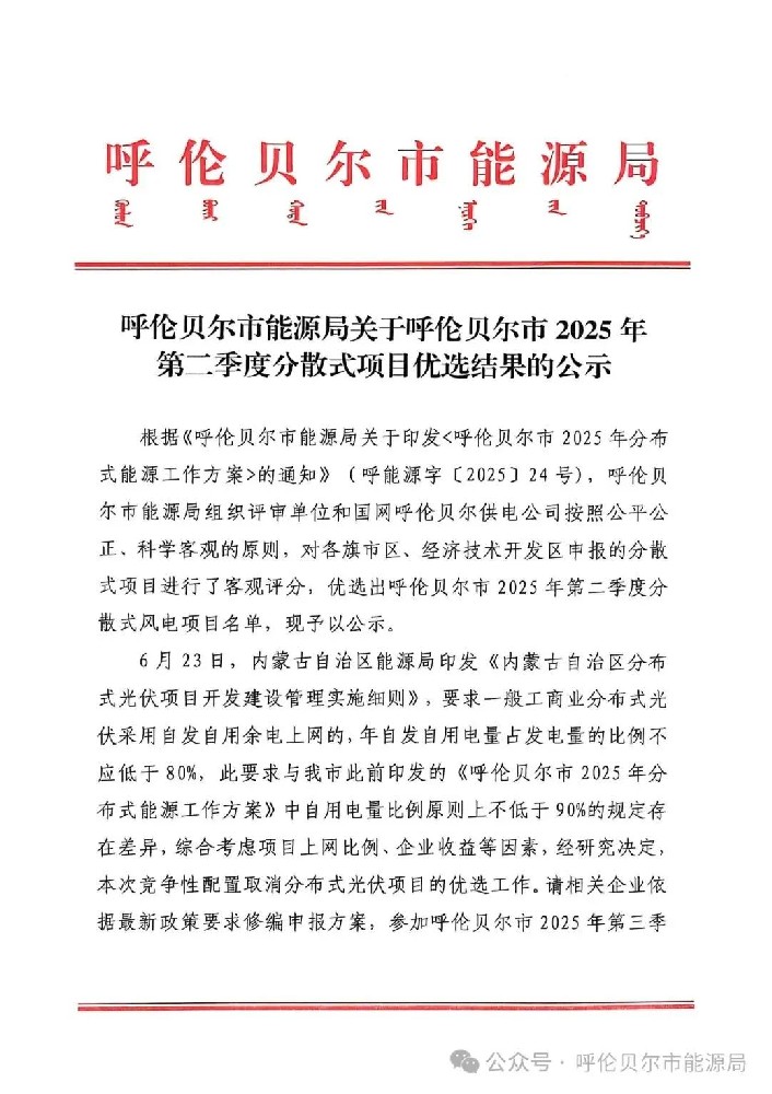6月27日,內(nèi)蒙古呼倫貝爾市能源局公示其2025年第二季度分散式項目優(yōu)選結(jié)果。