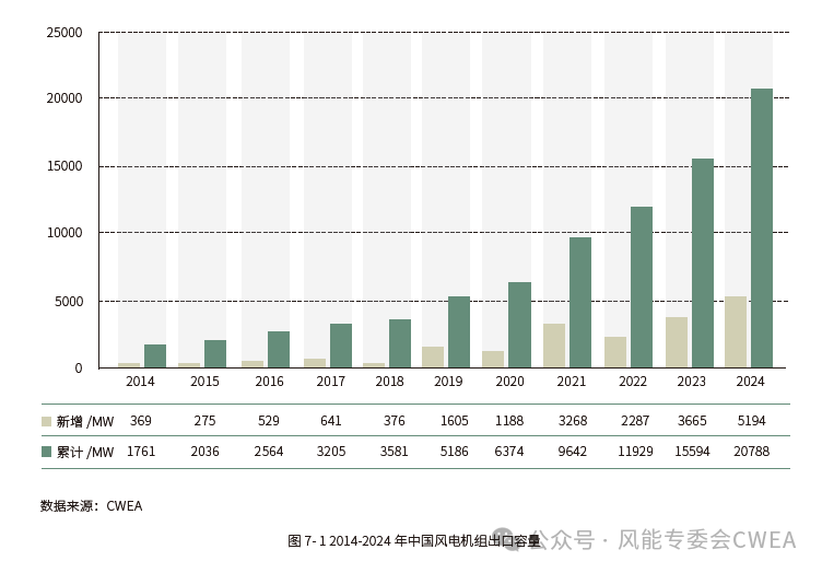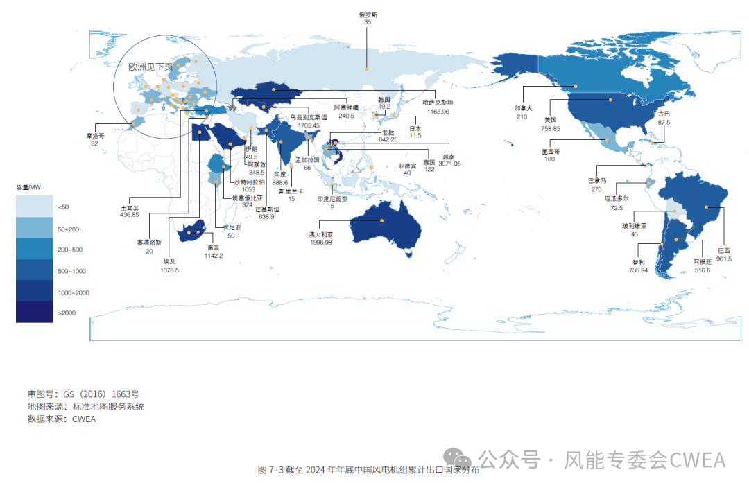 據風能專委會CWEA發布的最新《中國風電產業地圖2024》,2024 年,中國風電機組新增出口904 臺2,容量為5193.7MW,同比增長41.7%,其中:陸上風電機組出口882 臺,共計5115.5MW;海上風電機組出口22 臺,共計78.2MW。截至2024年年底,中國風電機組累計出口5799 臺,容量為20787.8MW,其中:陸上風電機組累計出口5661臺,共計20206.3MW,海上風電機組累計出口138 臺,共計581.5MW。