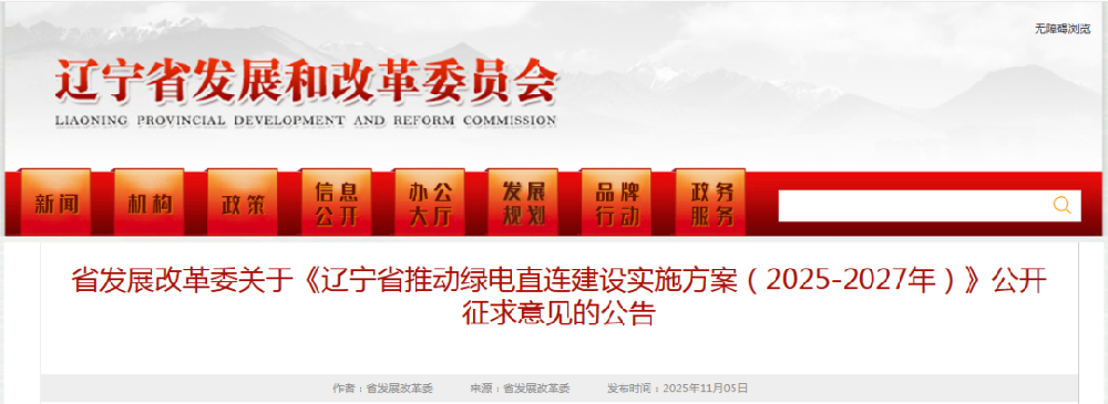 11月5日,遼寧省發(fā)展和改革委員會就《遼寧省推動綠電直連建設(shè)實(shí)施方案(2025-2027年)》公開征求意見。