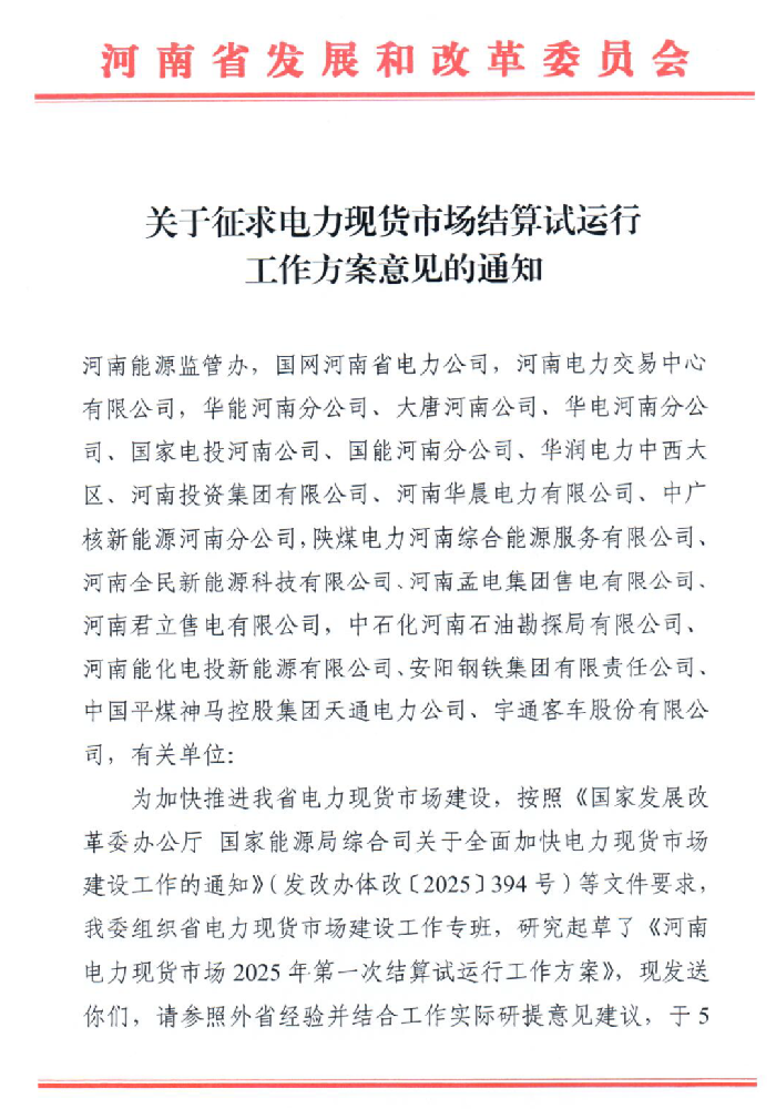 4月30日,河南省發改委發表了《關于征求電力現貨市場結算試運行工作方案意見的通知》,針對《河南電力現貨市場2025年第一次結算試運行工作方案》征求意見(以下簡稱《工作方案》)。河南將于5月份適時開展現貨市場結算試運行。